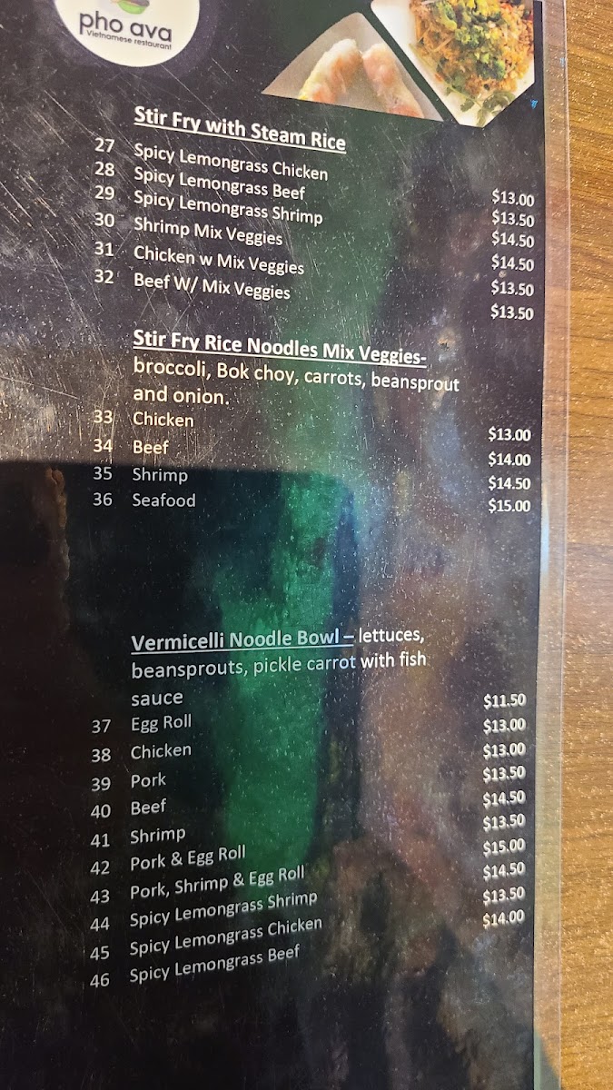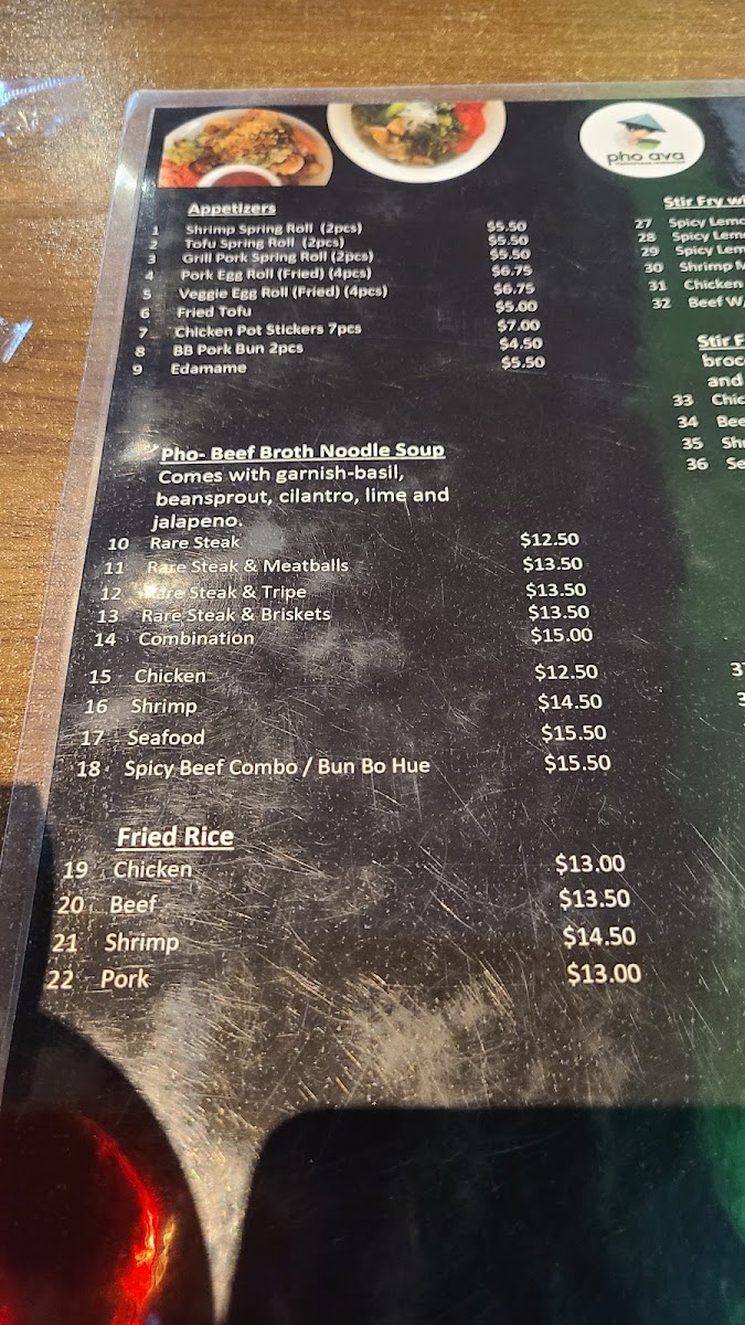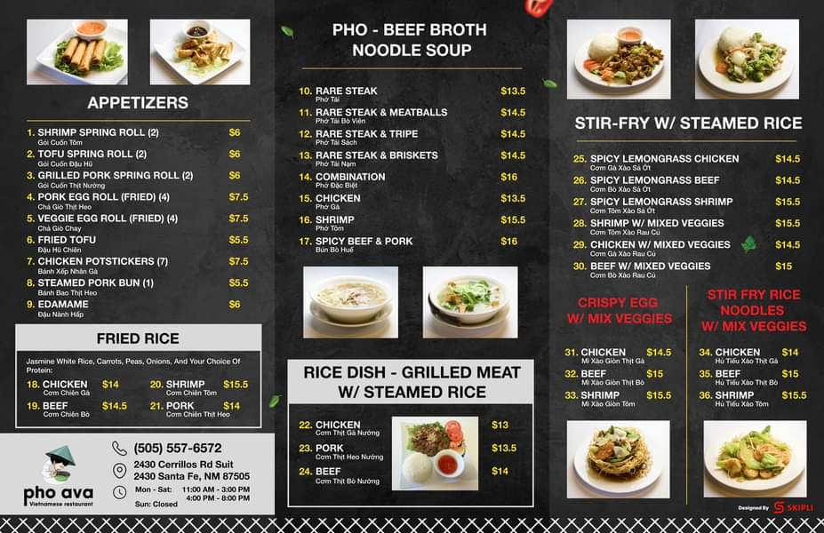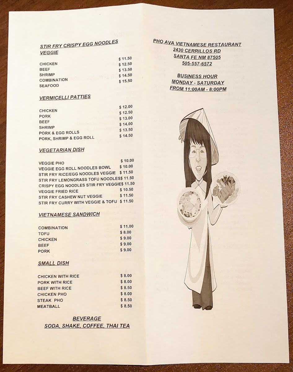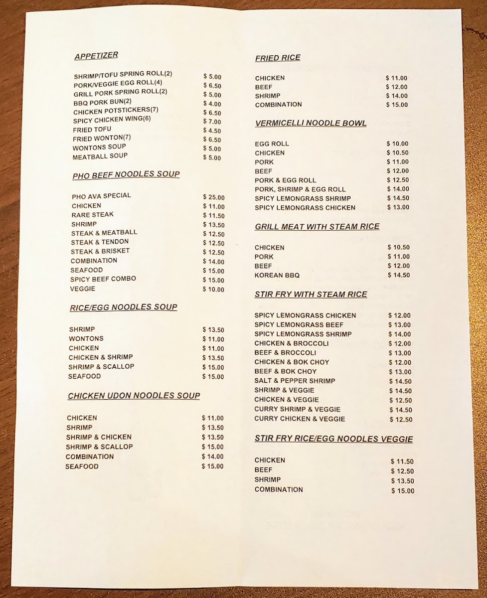 Pho Ava Vietnamese Restaurant Menu